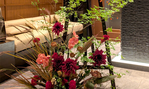 装花・生け込み・玄関エントランスの花【みなとみらい パーティー 花】ウェルカム装花を担当。グラントオリエンタルみなとみらいにて。/大きいフラワーアレンジメント教室 横浜