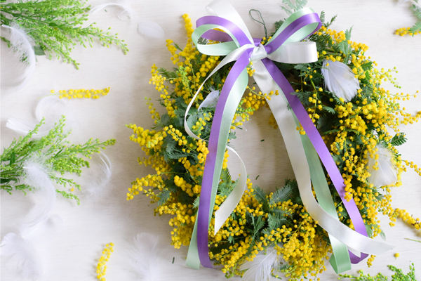 ミモザは2月の初めから3月に出回る春の枝物ですが、リース、アレンジメントに楽しむ事が出来ます。