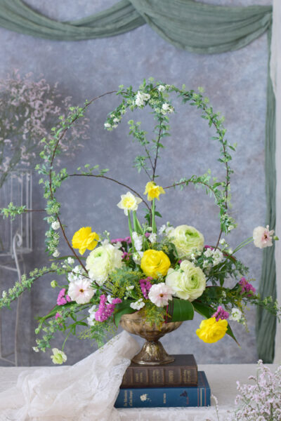 更に、こちらはコデマリで鳥かごのアーチを作り、その中に花を生けたデザインです。