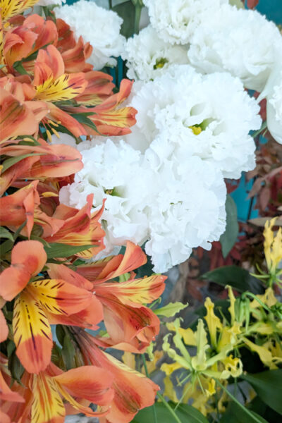 今回は透けるような光を感じる花合わせをイメージしてこの白いトルコキキョウ、オレンジ色のアルストロメリア、レモンイエローのグロリオサリリー、紅葉したナナカマドを選びました。