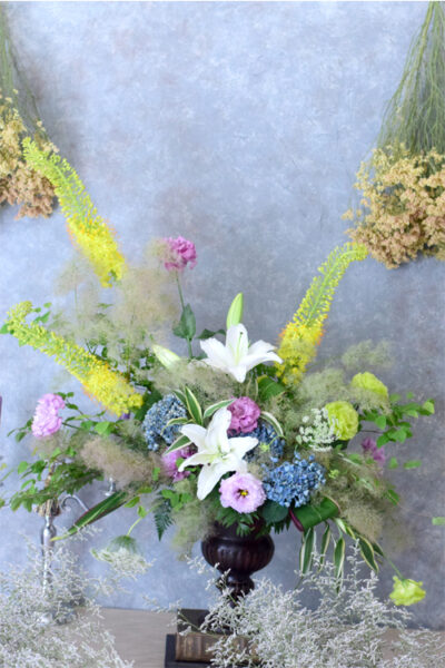 最後にこちらは夏の花エレムルスと、トルコキキョウを使ったアレンジメントをご紹介します。