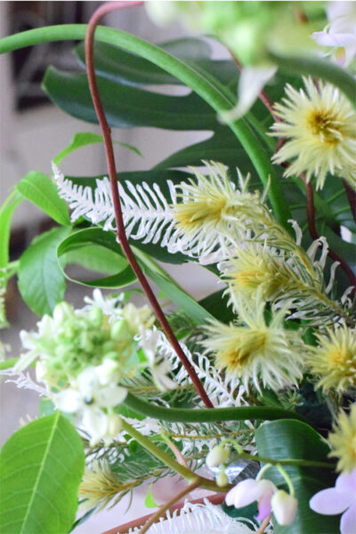 そのため、アレンジメントに空間が出来、爽やかさを演出しますが今回は葉や枝を剪定する事でアレンジメントを整えてお作りいただきました。