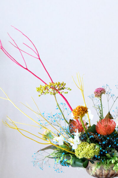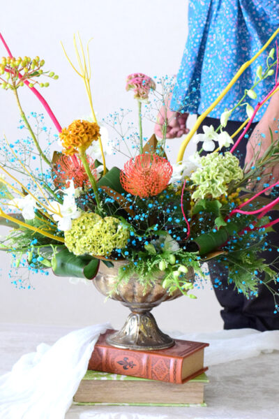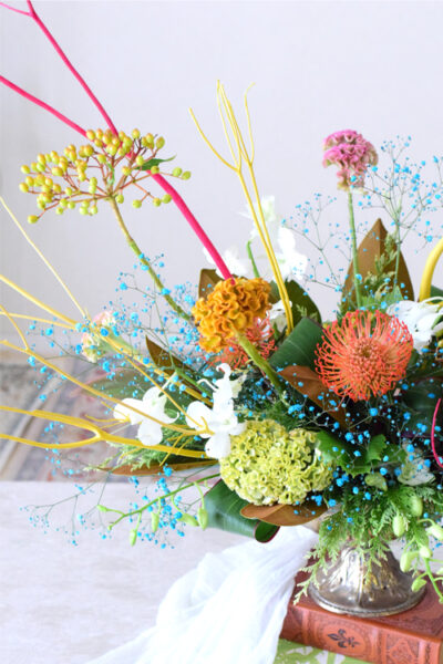 【フラワーアレンジメント 夏】カラフルな色合わせで夏のアレンジメント/大きいフラワーアレンジメント教室 横浜