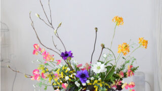 そして、こちらのアレンジメンの花合わせでは、華やかさも意識して選んでいます。