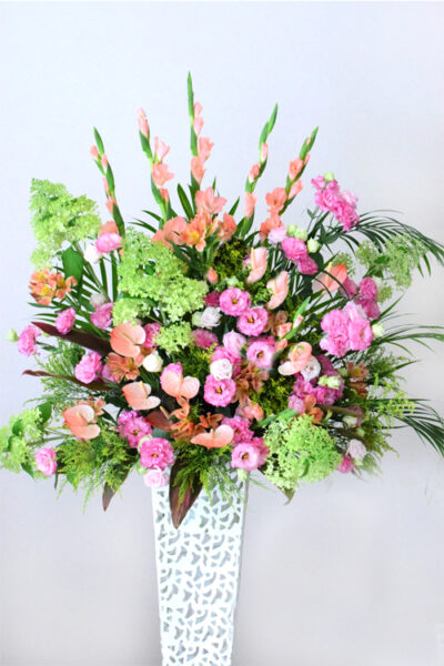 秋のスタンド花には紅葉した枝物や、リンドウ、秋色紫陽花、パンパスなどを使ってお作りしたいと思います。