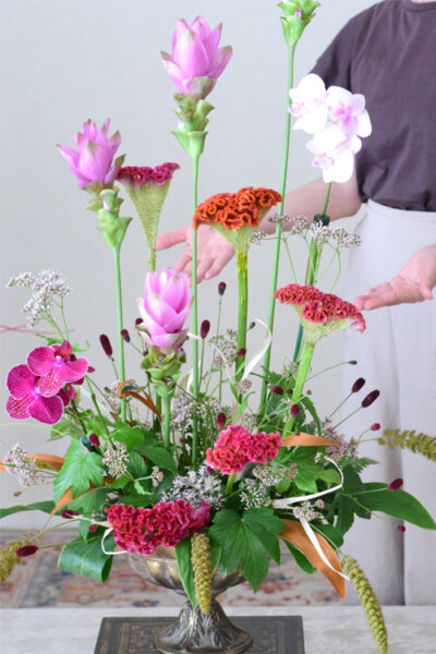 【フラワーアレンジメント デザイン】クルクマ、ケイトウを使ったアレンジメントのデザイン/大きいフラワーアレンジメント教室 横浜