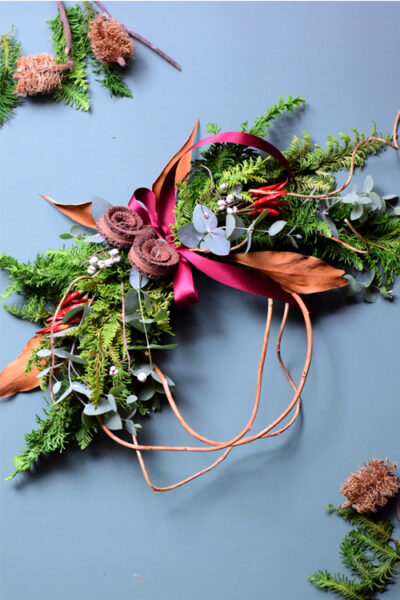 赤ツルを自由な大きさ、自由な形で巻いていただき、スワッグの形にした葉をつけて