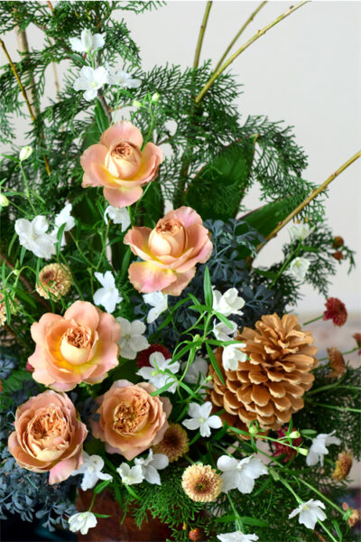 トライアングルのクリスマスのアレンジメントの中で、ほどよく崩しながらもバランスを取り、印象的なアレンジメントという、とても難しい生け方に挑戦され、見事に生けられたな。という印象のアレンジメントでした。