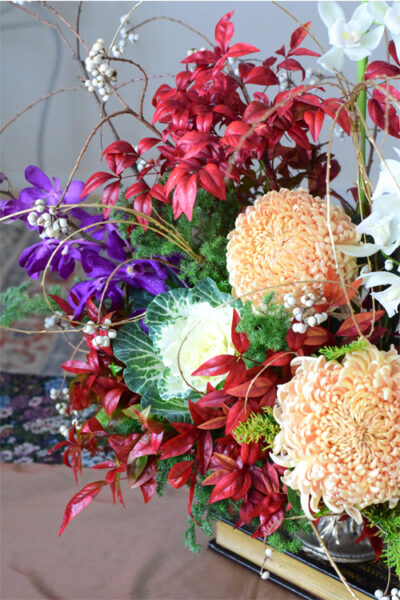 【正月 フラワーアレンジメント】アンティークな色の菊「レオン」で作るモダンな新春アレンジメント/大きいフラワーアレンジメント教室 横浜