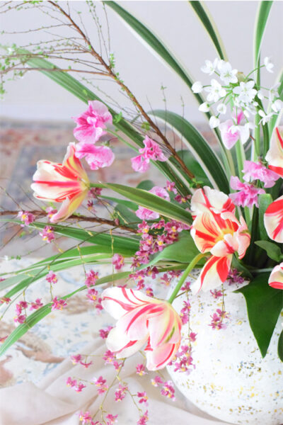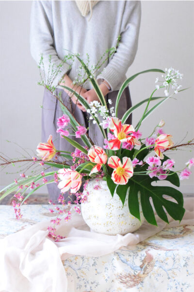 2つ目のポイントは、チューリップや枝もの、葉それぞれの個性を活かした「流れ」を表現する事です。