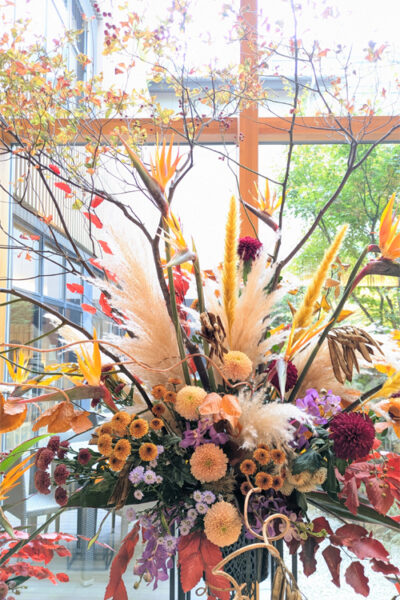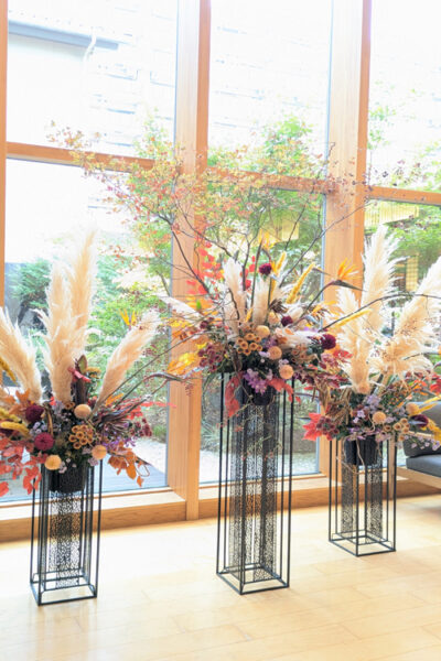 「源泉 湯けむりの庄」様での20分間。高さの違う3箇所の花器に生けられた秋の景色は、単なる装花を越え、会場が一体となり共に花を楽しむ事が出来ました。