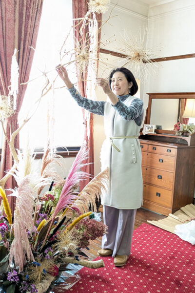 生花とドライフラワーを混ぜて、花持ちと秋の季節感を演出しながら各部屋テーマに合わせて生けました。