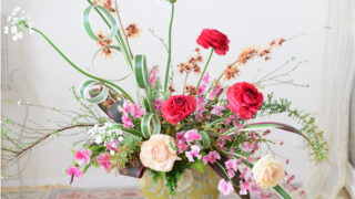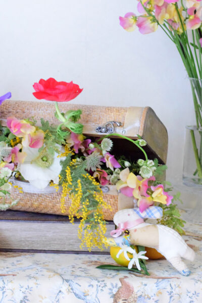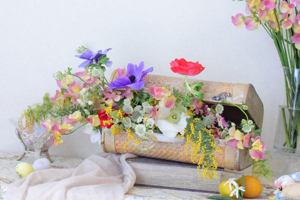 今回ご紹介するアレンジメントは、トランクにオアシスをセットして花が溢れるようなアレンジメンで