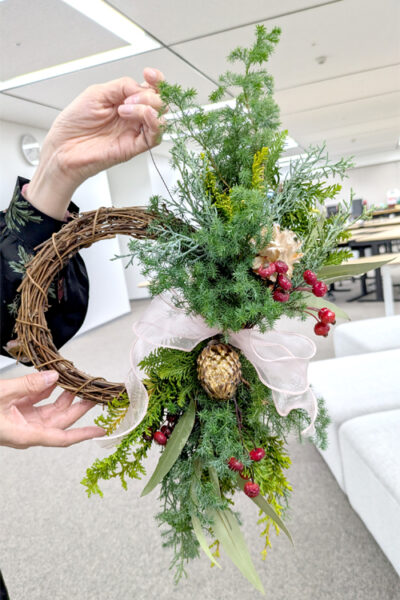 時々、皆様にクリスマスグリーンの香りなどもかいでいただき、作る楽しさだけではなく