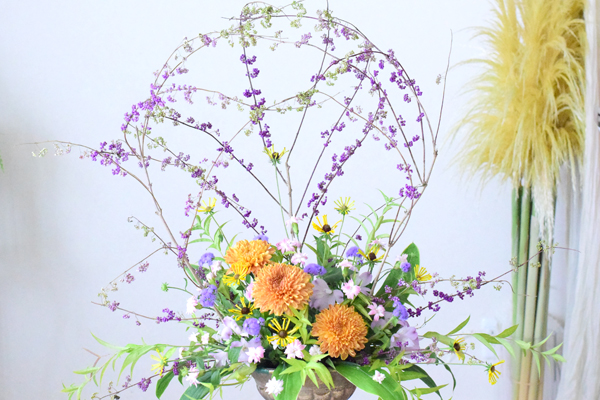 アレンジメント作品【秋 紫】ムラサキシキブという秋の紫色の枝物を使った大きいアレンジメント紹介/大きいフラワーアレンジメント教室 横浜 こんにちは。 横浜市泉区 1mを越す大きいフラワーアレンジメント教室 ブーケットパフュームの相沢知美です。 本日ご紹介する花はムラサキシキブという秋の枝物を使ったアレンジメントです。 紫色の小さい実が... 2025.10.09アレンジメント作品